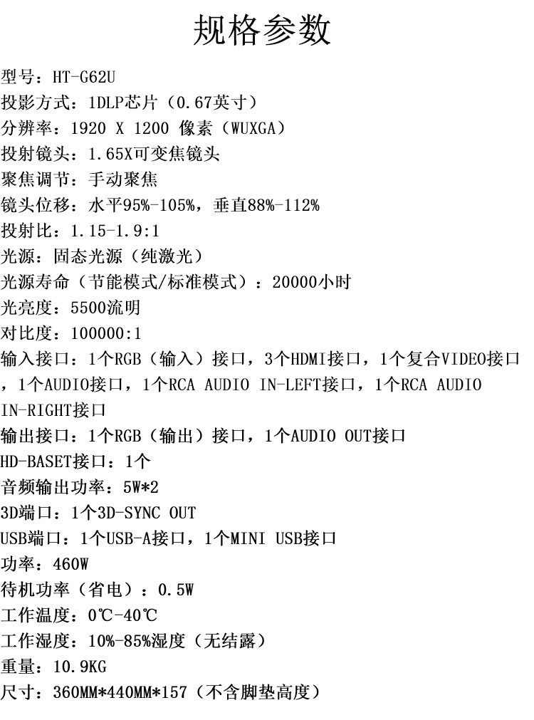 商品名称:鸿合(HiteVision) 激光投影仪 鸿合HT-G60X(5000流明 XGA) 官方标配